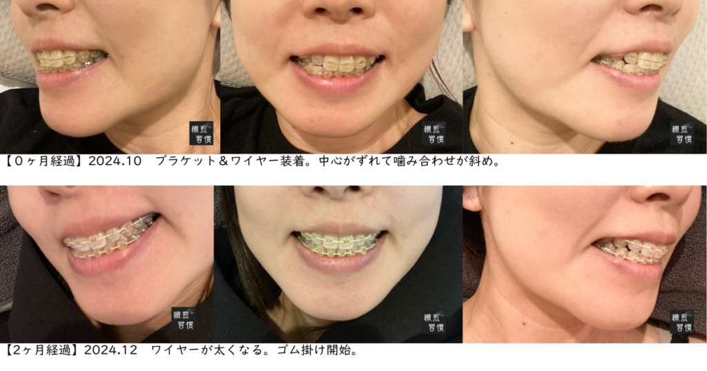 噛み合わせを整えるのに必須の「ゴム掛け」。こちらについては私自身かなり力を入れて、「絶対にサボらない!」を徹底しました。少しでもサボってしまうと後戻りしてしまい、いつまで経っても終わらないからです。カッコ悪くても、今日より明日のほうが良くなる!と自分に言い聞かせていました。こまめに写真を撮影したのもよかったですよ。どちらかと言うとこうしてブログに載せることよりも、自分自身のモチベーション維持に非常に役立ちました。1ヶ月でかなり歯が動きますので、毎月「サボらなくてよかった・・」と自分を褒めてあげることができました。月1回の検診でも「すごい良くなってるね!」と先生に褒めていただけると嬉しかったです・笑