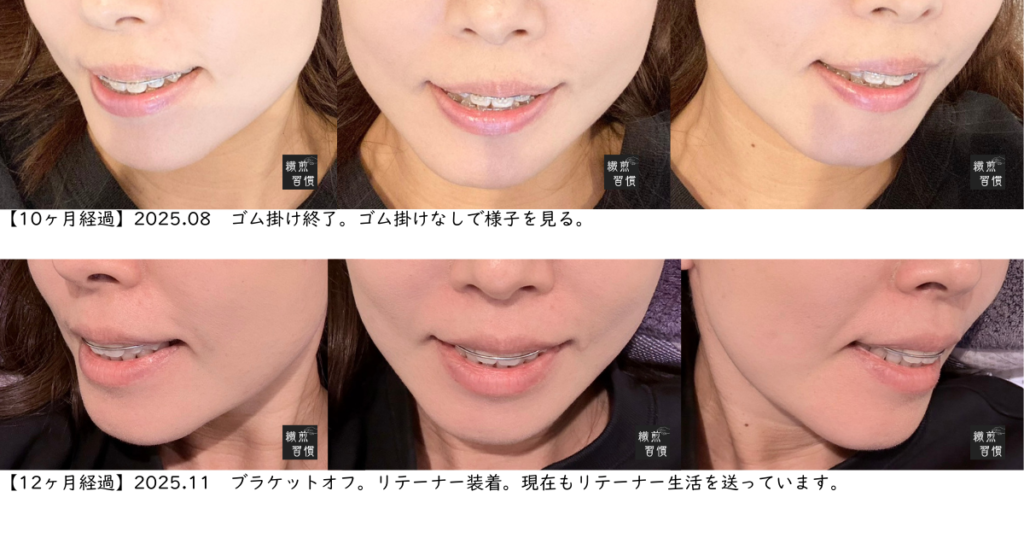 マスクにおいては、最初は気にしていたのですが、徐々に歯も動いてきて口元が引っ込んでくると、顔の輪郭もスッキリしてきて、「あ、ワイヤーがついててもいいか!」と思えてきました。最後の3ヶ月くらいはマスク無しで生活しました。夏〜秋にかけての暑い時期だったこともありますが